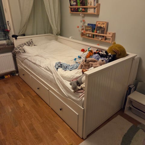 IKEA säng Brimnes Dagbädd utdragbar 80-160 cm med förvaring i vit färg. Sängen har utdragbara lådor undertill som ger extra förvaringsutrymme för till exempel sängkläder eller kläder. Passar som enkel/dubbelsäng i sovrum, gästrum eller barnrum. Madrasser ingår ej.