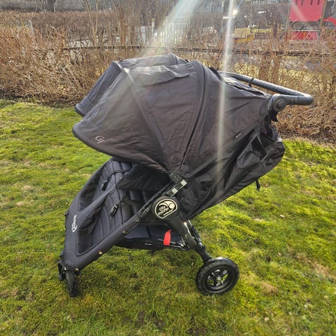 Dubbelvagn som snabbt kan fällas till att bli väldigt platt. Smidigt i bil och förvaras lättare i bostad. Funkar för rätt stora barn med klarar 45kg totalt. Också bra vagn för en längre person.