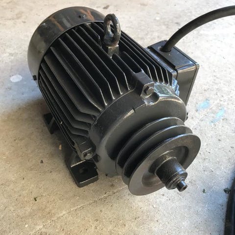 Elektromekano elmotor. Industrimotor monterad på trästativ med anslutningskabel. Typ- och data plåt från Elektromekano, Hälsingborg, sitter på motorn med uppgifter om fas, volt och varvtal. Lämplig som reservdel eller komponent i äldre maskinutrustning eller andra tekniska projekt där en kraftig elmotor behövs.