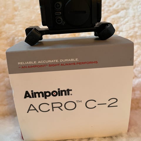 Blaser original skena med Spuhr ringar, picatinnyskena på ena ringen och fästplatta till Aimpoint Acro på den andra.