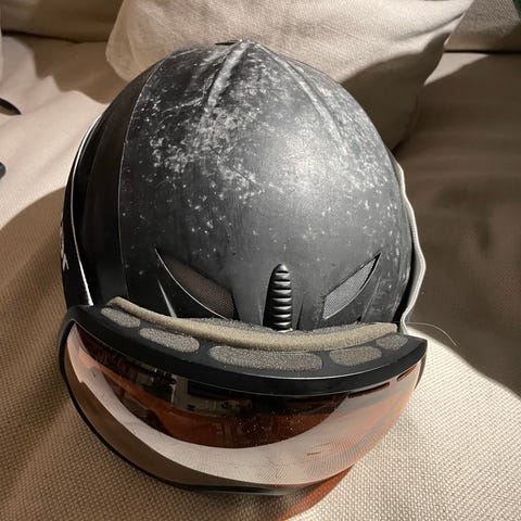 Salomon skidhjälm med integrerat visir. Hjälmen har ventileringsöppningar upptill och justerbart hakspänne. Det inbyggda visiret har spegelglas och täcker hela ögonområdet. Invändig vaddering för ökad komfort. Passar för alpin skidåkning eller snowboardåkning. Storlek Kids Medium. Endast använd en vecka.