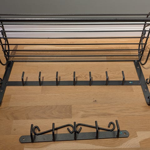 Hatthyll med 5 tillhörande galgar. Skohylla samt kroklist.