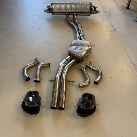 Ett komplett original avgassystem till BMW M4 Competition F32 LCI (Satt på en bil från 2018) . Avgassystemet är i nyskick då ett nytt eftermarknadssystem monterades direkt när bilen var ny.