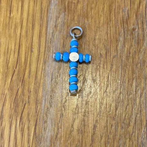 Antique Micro Mosaic cross set in copper and pretty tiny tiles (tesserae). There are pink flowers against blue background. Around 350 mm in body & the arms 250 mm / Antikt italienskt kors med mikromosaik monterad på koppar. Rosa blommor mot blå bakgrund. Ca 3,5 cm långt och 2,5 cm brett.