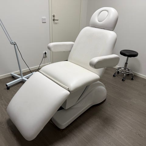 Elektrisk behandlingsstol i vit färg med klädsel i konstläder. Stolen har justerbar rygg- och fotdel samt armstöd. Den är utrustad med elektrisk reglering via handkontroll för att kunna ställa in önskad position. Passar för exempelvis skönhetsbehandlingar, fotvård eller massage i salong eller klinikmiljö.