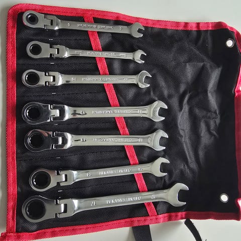 8,10,12,13,14,15,17, förvarade i ett hållarställ. Varje nyckel har en öppen ände och en ringände med spärr, anpassad för arbete med sexkantsbultar och muttrar. Lämplig för allmänt mek- och reparationsarbete i verkstad, garage eller hem.