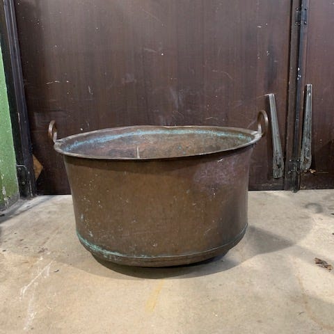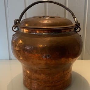 Kopparhink med handtag i smitt järn. Hinken har en cylindrisk form med något vidare nederkant och är tennfordrad inuti. 22 cm i diameter, 20cm hög. Passar exempelvis för förvaring, blomsterarrangemang eller dekoration inomhus eller utomhus.