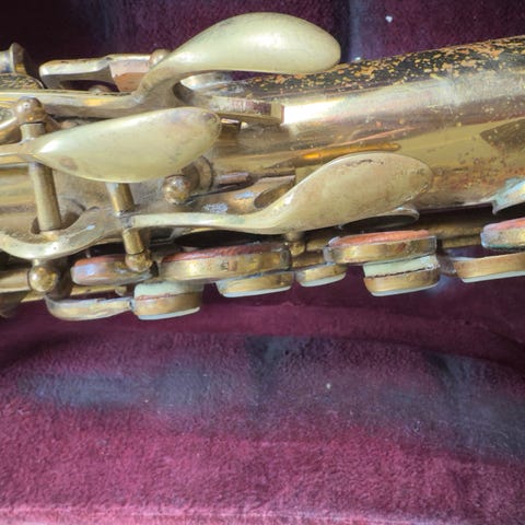 Jupiter altsaxofon med svartlackad kropp och guldfärgade mekanikdelar originalet.