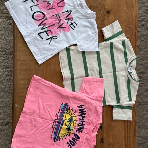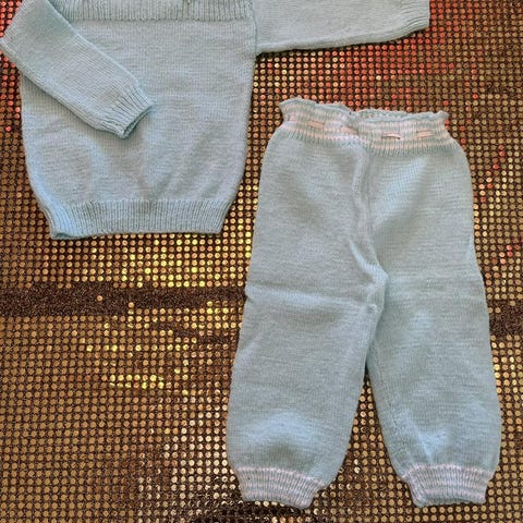 Set barnkläder bestående av tröja och byxa i bomull, unisex, storlek 86. Tröjan har flerfärgat djurmönster och rund hals med tryckknappar på axeln för enklare av- och påklädning. Byxan är enfärgad med resår i midjan för bekväm passform. Passar som vardagskläder för barn i storlek 86.