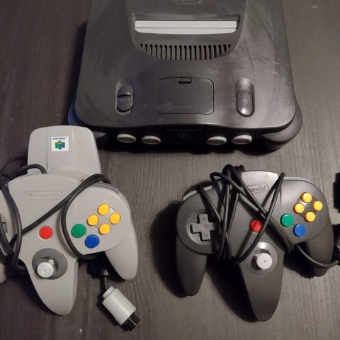 Nintendo 64 spelkonsol inklusive 4 grå handkontroller och 3 spel.