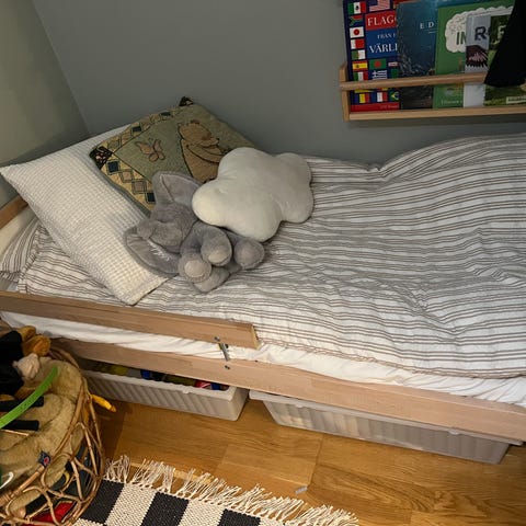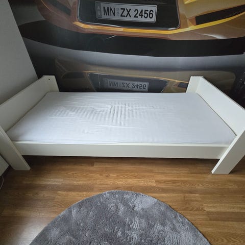 Fin juniorsäng i furu med fräsch madrass och nästan ny tunn plastad bäddmadrass.