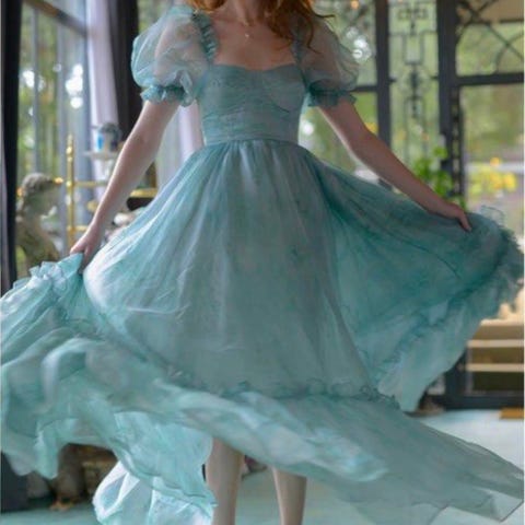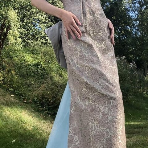 En fantastisk gammalvintage klänning i härlig grön färg. Om ni tittar på dom tre sista bilderna ser ni att den är lite trasig.