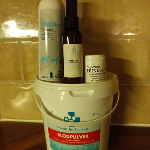 Div olika preparat för schamponering av katt och hund