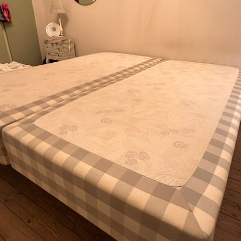 Hästens säng med klassiskt rosa-rutigt tyg. Sängen består av en underdel och en övre madrass i samma mönster. Passar som enkel- eller dubbelsäng beroende på mått. Ytskikt i textil med stoppning anpassad för sovkomfort. Lämplig för användning i sovrum som permanent sänglösning.