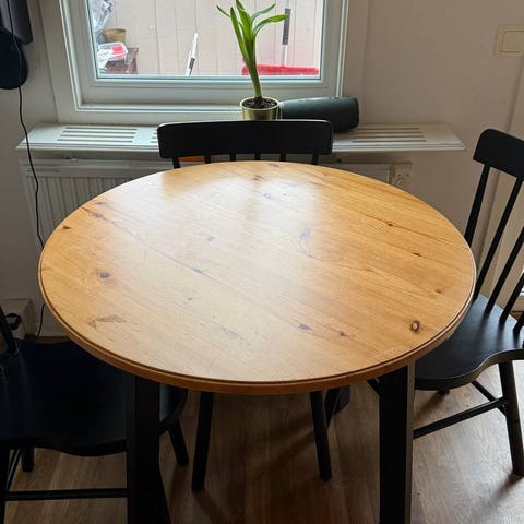 Säljer denna matgrupp då det blir för stort i vårat lilla kök. Det är ett bord och 4 stycken stolar. Bordet är nästan som nytt då det knappt har använts, och är köpt på Jysk. De 4 stolarna är köpta på Mio, och har små märken i materialet, inget som förstör funktionen dock (finns en bild på detta). Alla specifikationer om bordet är även i slutet av bilderna.