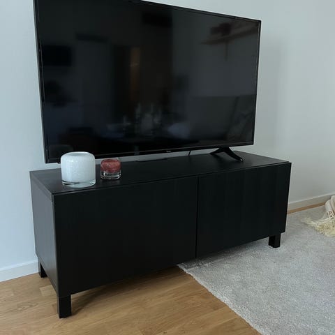 Tv-bänk i svart betsad träd mycket fin möbel som ny. Med skjutdörrar i glas med mjuk stängning. Tv bänken är köpt ny från IKEA pris 4295kr