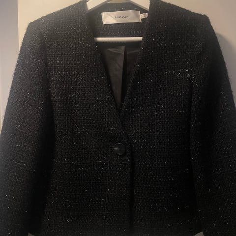 En elegant damdräkt i bomull bestående av kavaj och kjol i storlek S. Färgen är grå med svart mönster och svarta detaljer vid fickorna. Kavajen är knäppt framtill och har en klassisk passform. Kjolen är rak och matchar kavajens mönster. Plaggen är avsedda för dam och passar till exempelvis arbete eller mer uppklädda tillfällen.