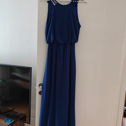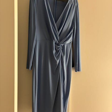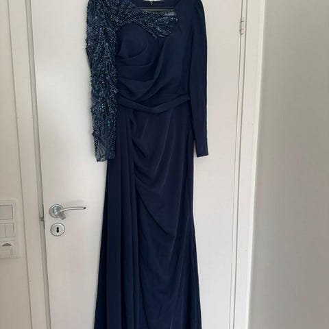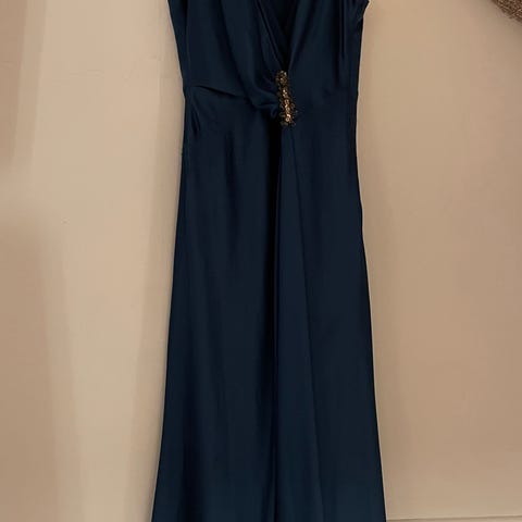omlott vid bysten och detaljerad midja. Hel och ren. Snygg slits i sidan och snyggt fall med underklänning. Passar super bra på bröllop eller balen. Dragkedja bak i ryggen.