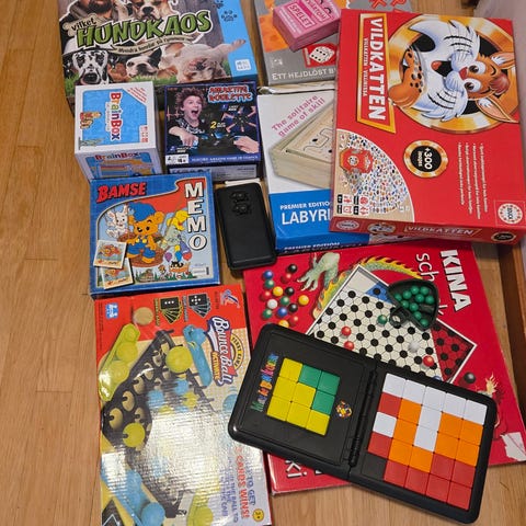 Paket med blandade sällskapsspel och barnspel. I uppsättningen ingår bland annat Eva och Adam, kimble, fem myror är fler än fyra elefanter, alibaba, bamses honungsjakt
