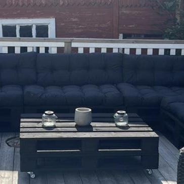 Utemöbelgrupp i rotting bestående av soffa, två fåtöljer och ett rektangulärt bord med glasskiva. Dynor i grått tyg ingår till soffa och fåtöljer. Möbelgruppen är avsedd för uteplats, altan eller inglasad balkong och ger sittplatser för flera personer runt bordet.