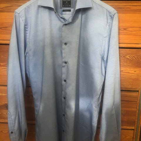 Blå skjorta med långa ärmar och knappar framtill. Skjortan har en klassisk krage och manschetter med knappar.
