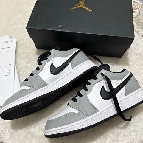 Air Jordan sneakers i storlek 40. Modellen är låg och har ovandel i syntet/läderliknande material med snörning. Skorna är grå och vita med kontrasterande svart logotyp och gummisula. Passar som vardagssko eller fritidssko.