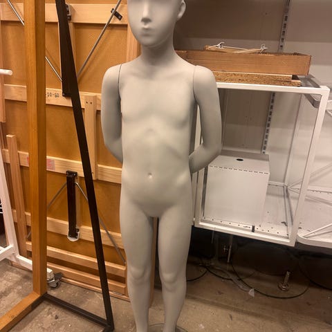 Dekorativ klädprovdocka i vitmålad metall. Dockan har ett öppet, snirkligt mönster och är utformad som en överkropp på stativ. Passar som inredningsdetalj, för upphängning av kläder eller smycken, eller som enkel visningsdocka i hem eller butik.