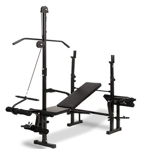 Träningsbänk med skivstång och vikter på nästan 20 kg sammanlagt