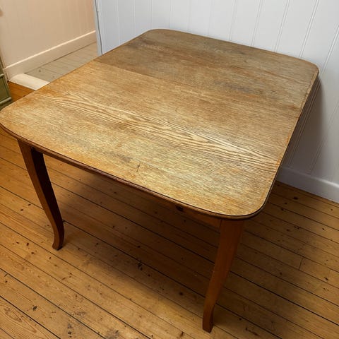 Matbord i massivt furu runt ca 110cm men finns 2 iläggsskivor a 50 cm allt inkl 6 stolar