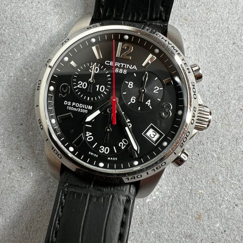 Funktioner: Tid, datumvisning vid klockan 6, och kronograf (stoppur)