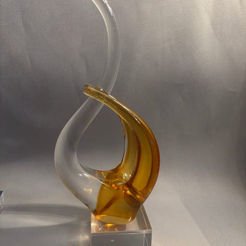 Konstnären och skaparen är oidentifierade av mig. Osignerad produkt, enligt notering. Snygg, abstrakt konst, elegant designad, väcker fantasi och avkoppling. Tunga glasväggar ca. 1800g. Mått: höjd ca. 24 cm. Bredd ca. 17 cm. Bas ca. 8,5 cm. Skick: Nära nyskick. Passar bra som present- eller inredningsdesign exponerad i ditt heminredning eller kontorsbord,,, Pris -1750 kr