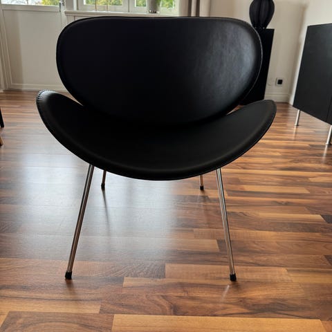 Designad fåtölj i svart skinn med ben i svartlackerad metall.