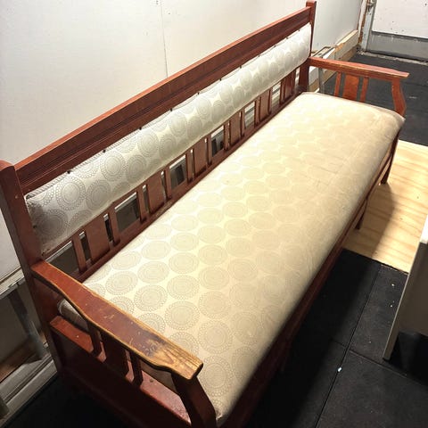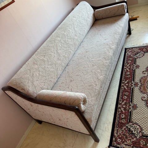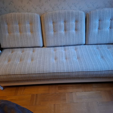 Superfin och bekväm beige manchester-bäddsoffa med stabil stomme i mörkt trä. Jag älskar den men den är lite för stor och används för sällan här hemma. Bra begagnat skick och väl omhändertagen. Soffan fälls enkelt ut och upp till en dubbelsäng, perfekt för gäster. Hoppas den kan hitta en nytt hem där den får mer gos och kärlek!