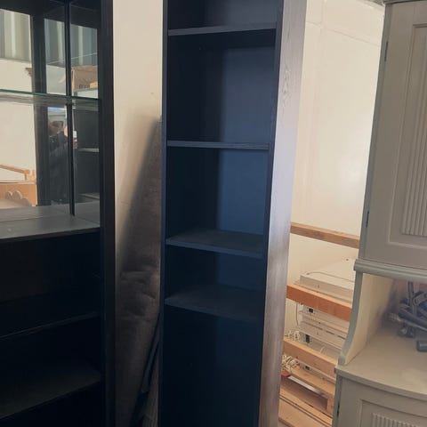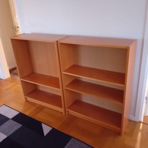 IKEA bokhylla i träfaner med tre öppna hyllplan. Passar för förvaring av böcker, pärmar eller prydnadssaker i vardagsrum, sovrum eller kontor. Fristående modell som kan placeras mot vägg eller i ett hörn beroende på utrymme.