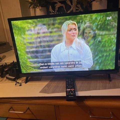 Samsung tv i svart utförande. Platt skärm med bordsstativ och medföljande fjärrkontroll synlig på bilden. Lämplig för användning i vardagsrum, sovrum eller som extra tv i hemmet. 55 tum ej smart tv.
