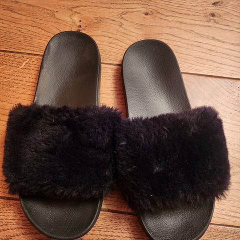 Fluffiga svarta tofflor (38-39) slip-in med nallar/pärlor/rosetter