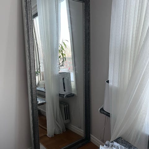 Säljer en stor silvrig spegel. Går att ha ståendes som på bilden eller hängandes på väggen.