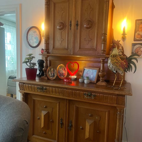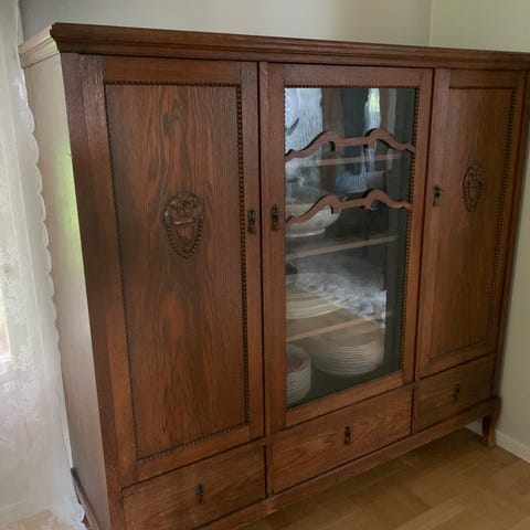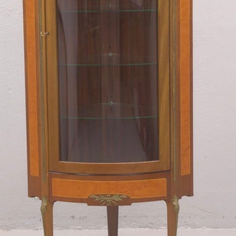 Vitrinskåp i brunt trä med överskåp och underskåp. Överskåpet har två glasdörrar med spröjs och hyllplan för förvaring eller exponering av porslin och prydnader. Mellan överskåp och underskåp finns en öppen hylla. Underskåpet har två lådor upptill samt två dörrar med utskurna dekorativa detaljer och förvaringsutrymme bakom. Skåpet står på låg sockel och är avsett för användning i till exempel vardagsrum, matsal eller kök för förvaring av porslin, glas och andra hushållsartiklar.