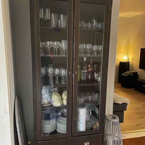 IKEA vitrinskåp med glasdörrar i mörkt trä