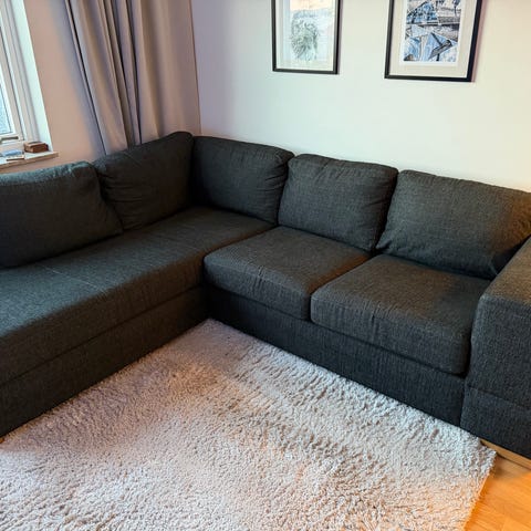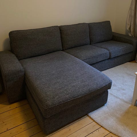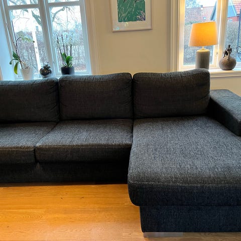 Väldigt fint skick samt att det går att tvätta alla kuddfodral. Kan få med en fotpall i samma tyg i måtten 92*92 cm.