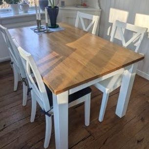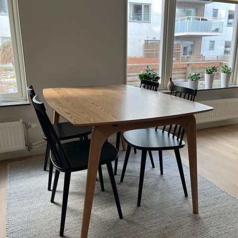 Bord från IKEA (se produktbild) 140cm brett samt fyra stolar från Jotex. Allt är i fint använt skick, vissa av stolarna har lite skavanker bakpå, annars hela och fina! Paketpris 1800kr. Säljes ej separat. Hämtas av köparen, finns i Täby.