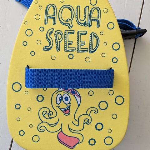 Sökt simträningsset bestående av flera delar för simträning. Setet innehåller ett par korta simfenor i gummi (storlek 41–43 enligt märkning på sulan), ett par handpaddlar, en dolme/pull buoy, en simbräda samt en blå nätpåse med dragsko för förvaring och transport. Utrustningen är avsedd för simträning och teknikövningar i bassäng för vuxna eller äldre ungdomar.