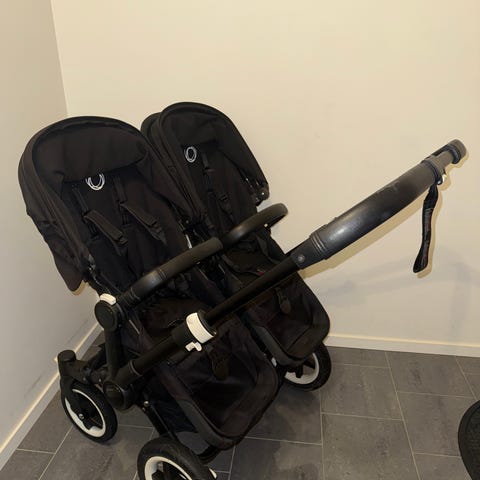 Bugaboo syskonvagn i svart utförande. Vagnen har två sittdelar bredvid varandra med individuella suffletter.