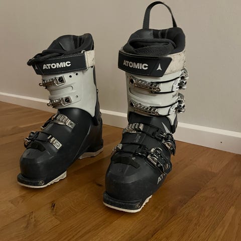 Atomic pjäxor i grått med vita och ljusblå detaljer. Modellen är unisex och har fyra spännen framtill för justerbar passform. Insidan har mjuk och vadderad innersko med pälsfodrad kant för extra komfort och värme. Passar för alpin skidåkning med standard alpina bindningar. Storlek 25,5/26 passar 39-40, sulmått 304 mm.