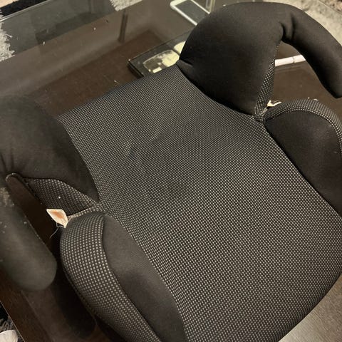 Sitsen är vadderad för ökad komfort. Solblekt på framförallt nackstödet. Passar för användning i bil enligt tillverkarens anvisningar och monteras med bilens säkerhetsbälte eller enligt bilens och stolens instruktioner.