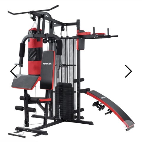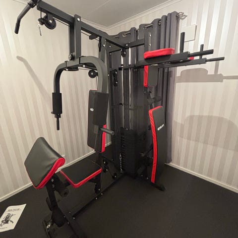 Multigym träningsstation med viktmagasin och kabelsystem. Utrustad med sittdyna, ryggstöd och armstöd i svart klädsel. Maskinen har flera handtag och dragstationer för olika styrkeövningar för över- och underkropp. Passar för inomhusbruk i hemmagym eller träningsrum.
