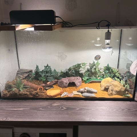 Terrariet fungerar men är i dåligt skick med sprickor i botten och kanter.