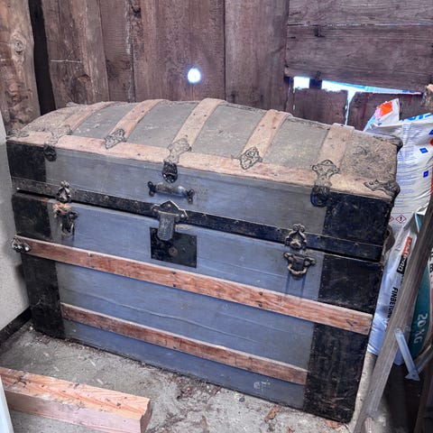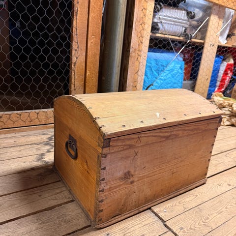 Vitmålad kista i trä med välvd lockkonstruktion. Utrustad med bärhandtag på sidorna och låsbeslag på framsidan.. Lämplig som förvaring eller som inredningsdetalj i hemmet.
