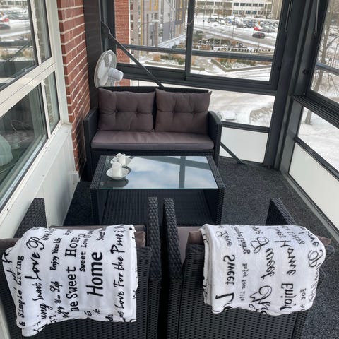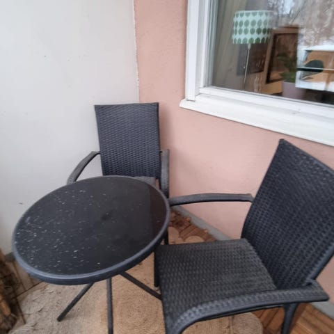 Balkongmöbelset bestående av en soffa, två fåtöljer och ett runt bord. Möblerna har svart stomme och svarta dynor. Setet är anpassat för användning utomhus, exempelvis på balkong eller mindre uteplats. Passar för sittgrupp med plats för flera personer. Kuddar och textilier på bilden kan användas som exempel på hur möblerna kan inredas. Du får allt som syns i bilden
