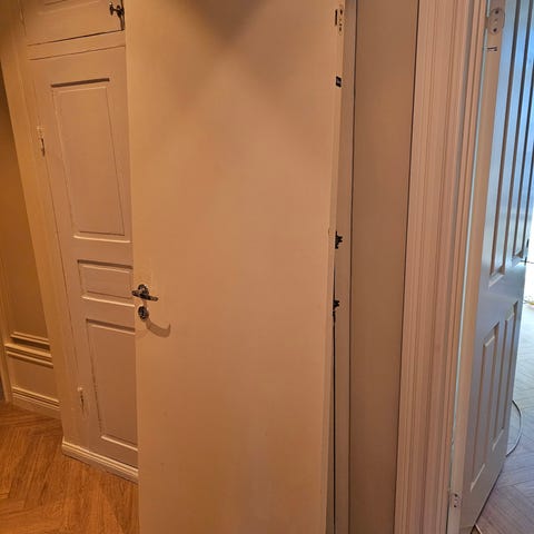 Säljer en gammal kompakt vit innerdörr med monterat dörrhandtag och lås.